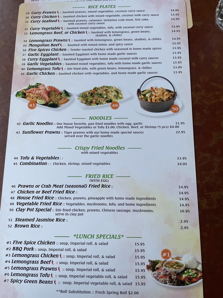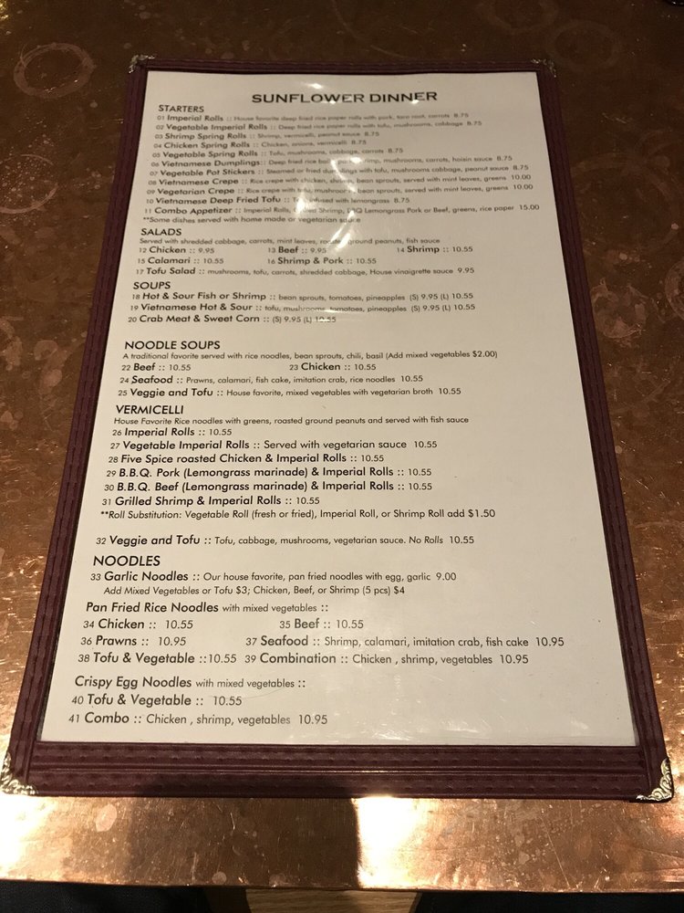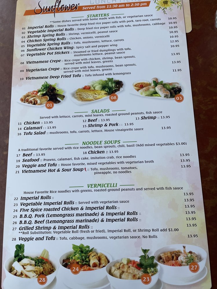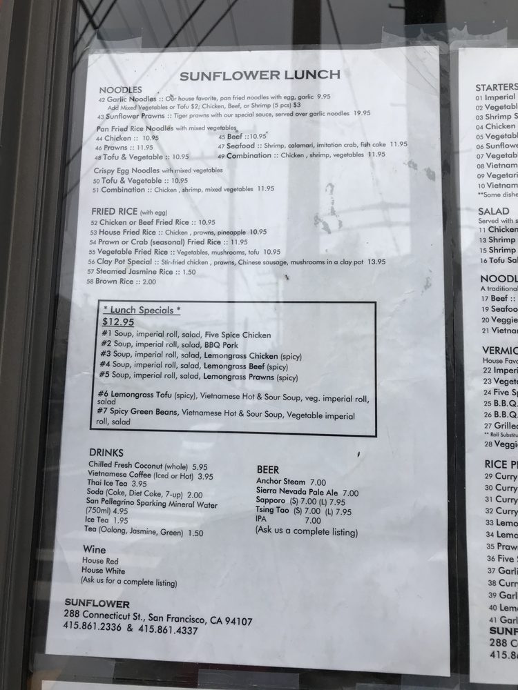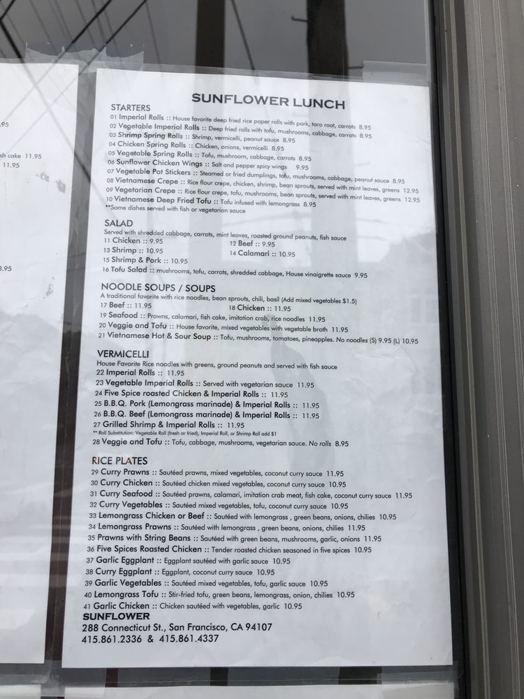 Sunflower Vietnamese Restaurant, located in San Francisco, offers a casual dining experience with a wide range of Vietnamese dishes. With options for vegans and vegetarians, Sunflower also accepts various payment methods, including cryptocurrency. The menu includes traditional Vietnamese classics like garlic noodles, vermicelli bowls, and flavorful pho. Customers praise the aromatic and tasty grilled meats, as well as the affordable prices. The restaurant's convenient location and quick service make it a great spot for lunch or dinner. Whether you're craving a refreshing bun bowl or a comforting bowl of pho, Sunflower Vietnamese Restaurant has something for everyone. Experience the flavors of Vietnam in the heart of San Francisco at Sunflower.